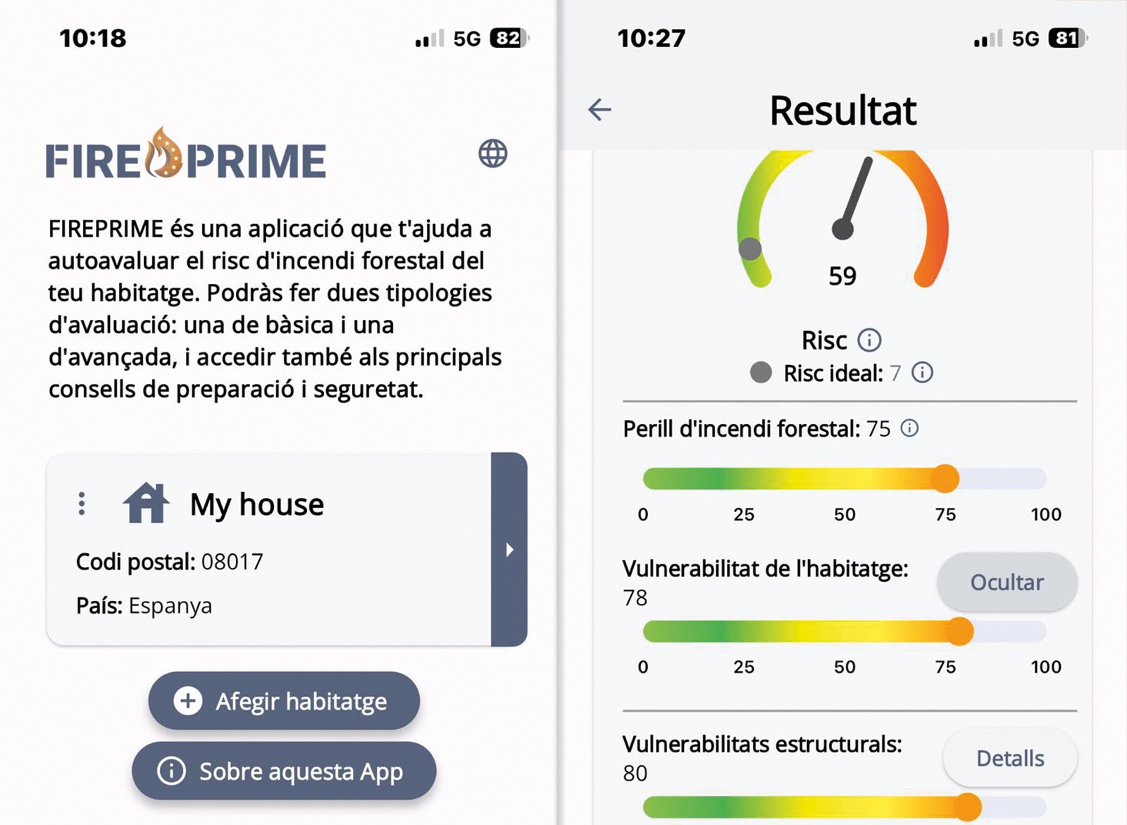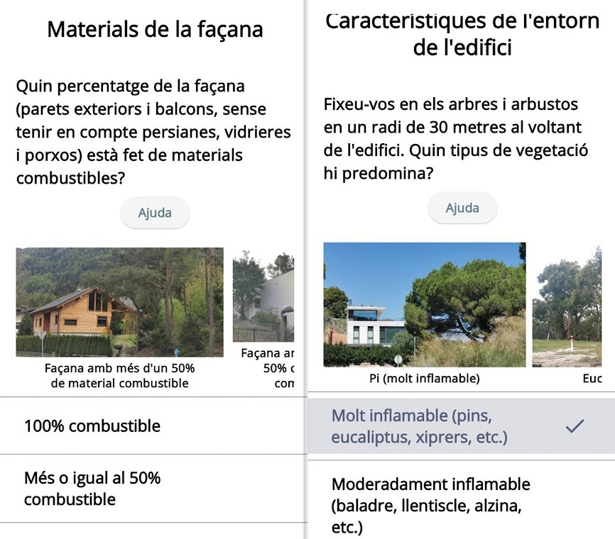Els usuaris poden escollir entre dues modalitats d’anàlisi: una avaluació bàsica de 10 preguntes de sí/no que permet obtenir un diagnòstic ràpid del risc, i una avaluació avançada de 23 preguntes de resposta múltiple que aprofundeixen en aspectes constructius, ambientals i de gestió del combustible vegetal i no vegetal proper a l’habitatge. A més, l’app facilita també l’accés a recomanacions oficials d’autoprotecció en cas d’incendi, presentades de manera clara i amb el suport d’infografies.