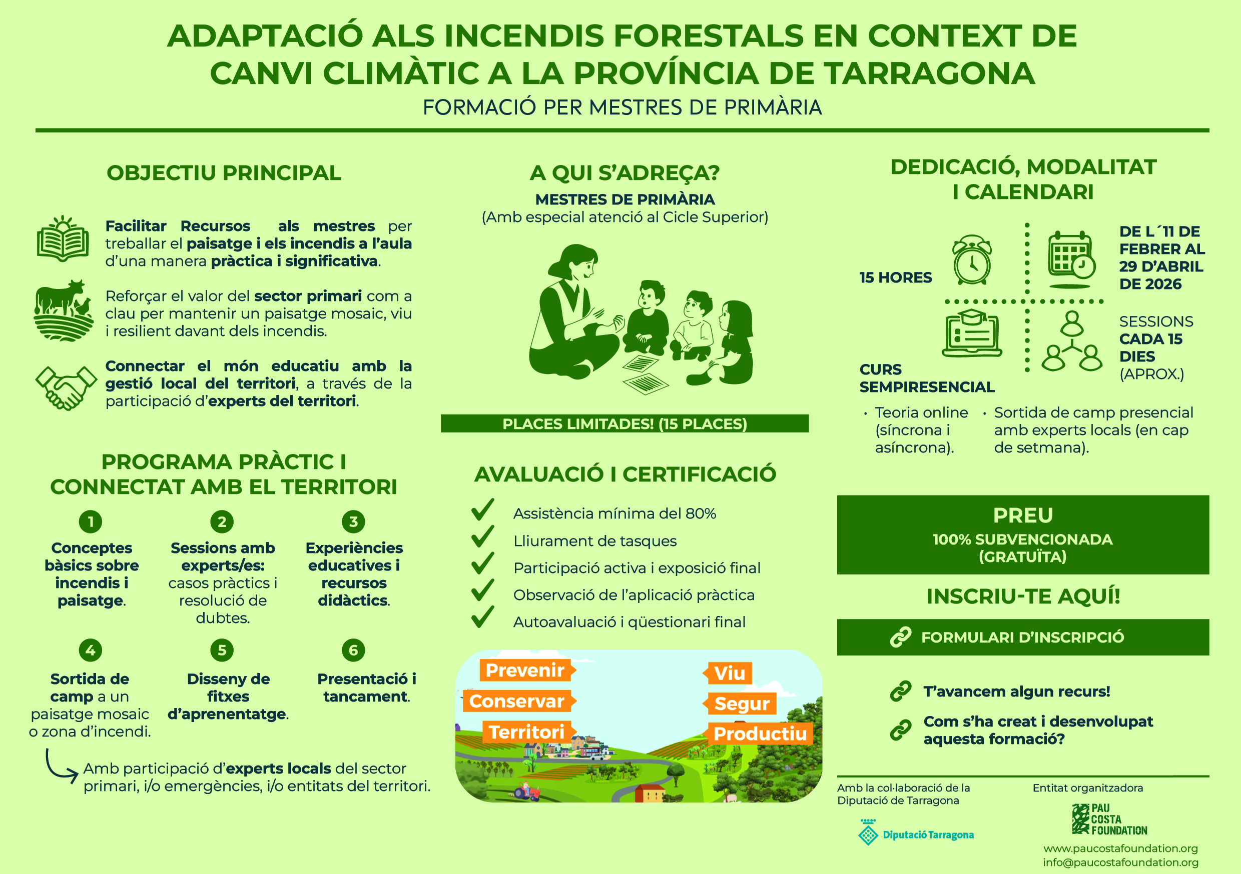 Davant d’aquesta realitat i en un context de canvi climàtic, neix el projecte “Formació per a mestres de primària: adaptació als incendis forestals en context de canvi climàtic a la província de Tarragona”. L’objectiu principal és facilitar eines i recursos educatius perquè els i les docents puguin treballar a l’aula la temàtica dels incendis forestals i la gestió del paisatge, adaptada a la realitat local.