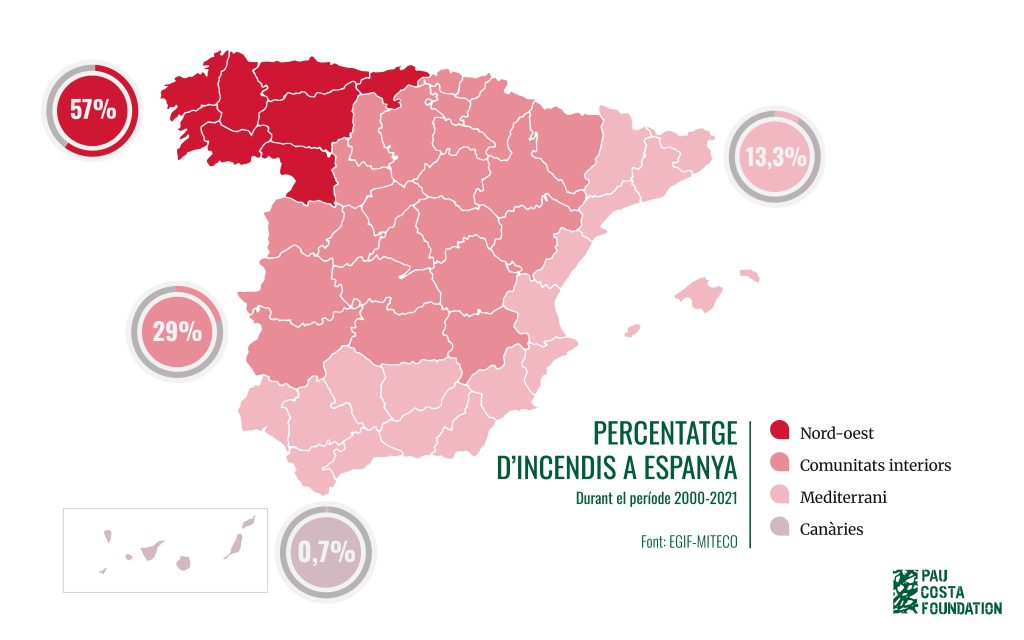 Si ens pregunten on passen més incendis forestals a Espanya, probablement pensarem en la zona mediterrània, pel seu clima càlid i sec. Tanmateix, la realitat és una altra: és el nord-oest de la península el que lidera les estadístiques d’incendis forestals. Però, per què passa això? T’ho expliquem a continuació.