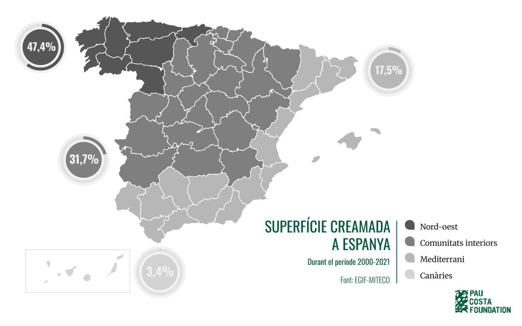 Per poder comprendre millor aquesta anàlisi sobre els incendis forestals al nord-oest peninsular, és important aclarir que ens referim a les comunitats autònomes d’Astúries, Cantàbria, Galícia i les províncies de Lleó i Zamora*. Aquesta divisió geogràfica respon a una classificació de l’Àrea de Defensa Contra Incendis Forestals (ADCIF) del Ministeri per a la Transició Ecològica i el Repte Demogràfic (MITECO), que agrupa els diferents territoris segons les seves similituds pel que fa al nombre, superfície i causes dels incendis. D’aquesta manera, el territori espanyol queda dividit en quatre àrees geogràfiques (Mediterrani, Comunitats Interiors, Canàries i Nord-oest).