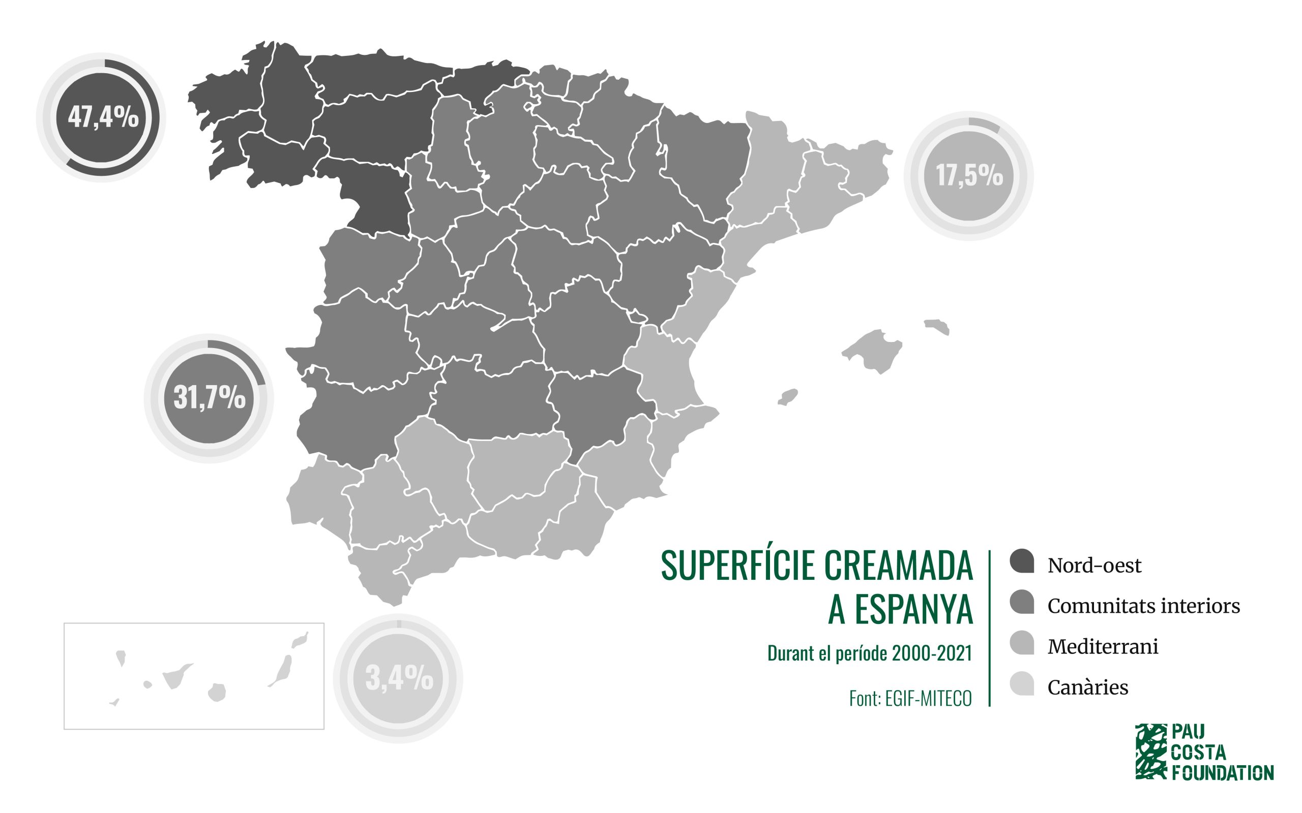 Figura 1. a. Percentatge d’incendis durant el període 2000-2021 a les quatre àrees geogràfiques (Mediterrani, Comunitats Interiors, Canàries i Nord-oest)