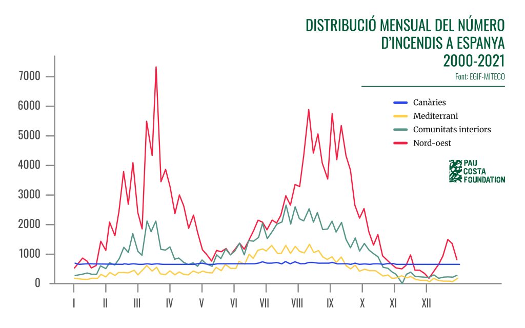 Aquí és on el patró esdevé encara més sorprenent. Mentre que a la major part d’Espanya els incendis tradicionalment es concentren a l’estiu, al nord-oest peninsular molts d’ells es produeixen a l’hivern i a principis de primavera (Figura 3).
