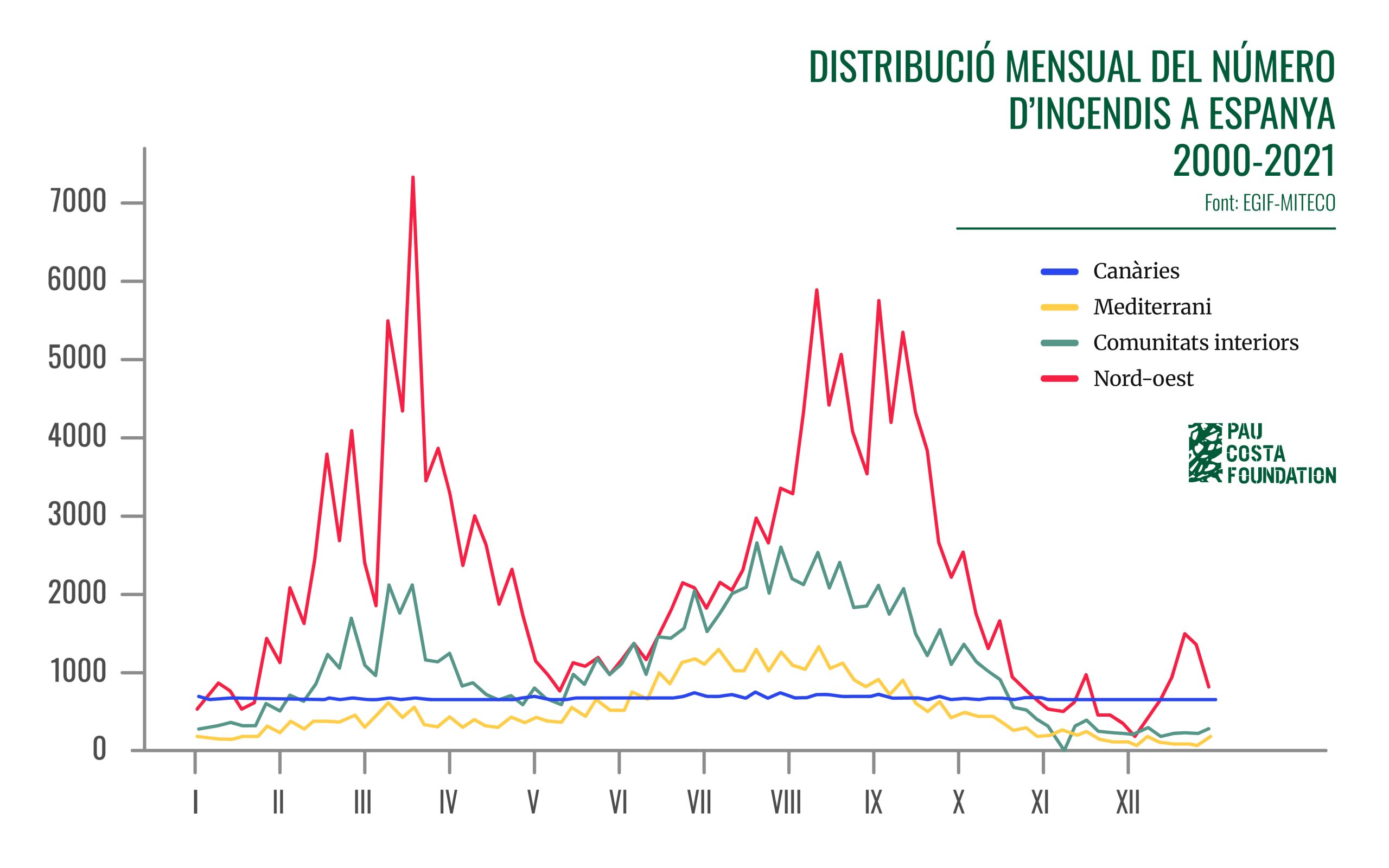 Figura 3. Distribució mensual del nombre d’incendis durant el període 2000-2021 a les quatre àrees geogràfiques (Mediterrani, Comunitats Interiors, Canàries i Nord-oest)