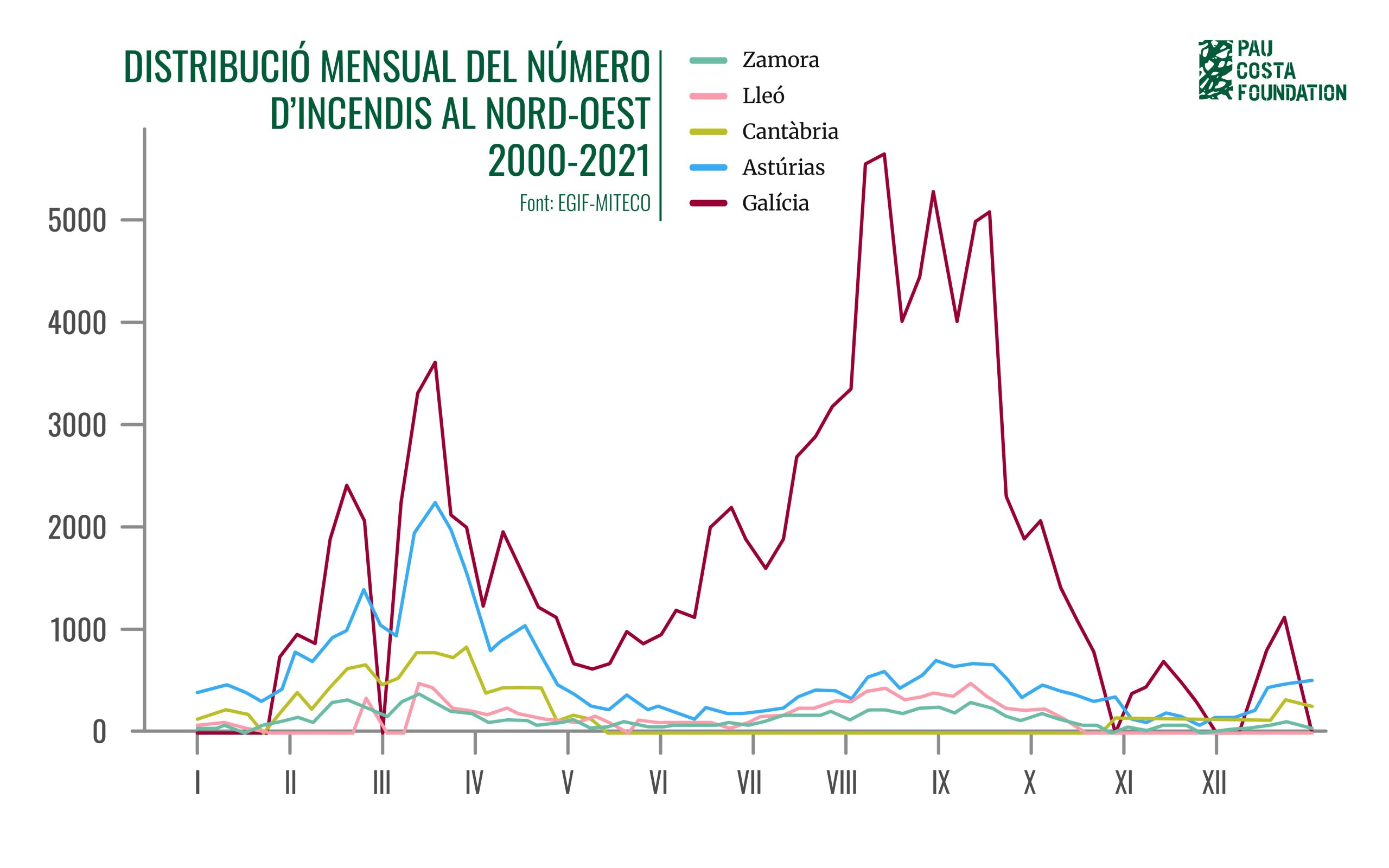 Figura 4. Distribució mensual del nombre d’incendis durant el període 2000-2021 a les comunitats autònomes de Galícia, Astúries i Cantàbria, i les províncies de Lleó i Zamora que formen part de l’àrea geogràfica del Nord-oest.