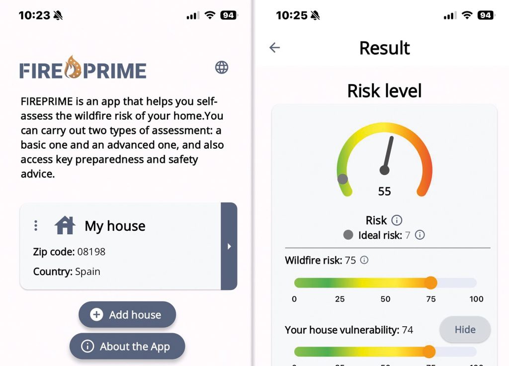 The FIREPRIME app offers residents of wildland–urban interface areas an intuitive and rigorous tool to understand risk and assess the vulnerability of their homes to wildfires, enabling them to make informed decisions to improve household safety. This free app, available in English, Spanish, Catalan, German, and Swedish, and already accessible on Google Play and the App Store, has been developed by the GESSI research group at UPC, incorporating a risk analysis algorithm designed by CERTEC-UPC, BOKU (Austria), and RISE (Sweden). All these institutions, together with the UOC and the Pau Costa Foundation, are members of the FIREPRIME project.