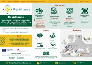 El objetivo de ResAlliance es facilitar el flujo de información y conocimiento y aumentar la concienciación, comprensión y capacidad de los agricultores y forestales sobre la resiliencia del paisaje en los países mediterráneos. Específicamente, ResAlliance reunirá y evaluará las necesidades de conocimientos y prácticas, brechas, obstáculos, soluciones y buenas prácticas para lograr paisajes resilientes, haciendo especial hincapié en las medidas contra los peligros causados por el cambio climático. También preparará y facilitará el compromiso de los diferentes actores, mediante métodos de participación interactivos e innovadores. Por último, transferirá los conocimientos y activará la gobernanza regional de la resiliencia del paisaje, con especial énfasis en cinco regiones mediterráneas.